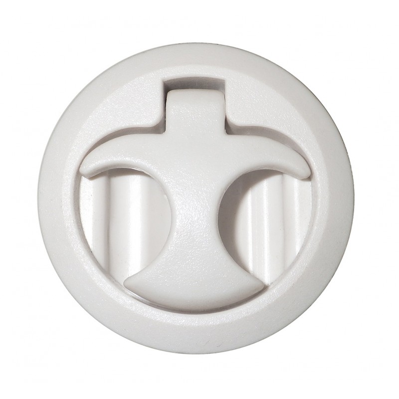 Alzapagliolo in nylon bianco, con maniglia a molla e fermo a scatto.Completo di squadretta di battuta in acciaio inox, anelli in gomma di spessore mm. 3/6/9, foro Ø mm. 50, utilizzabile per spessori da mm. 11 a mm. 15.