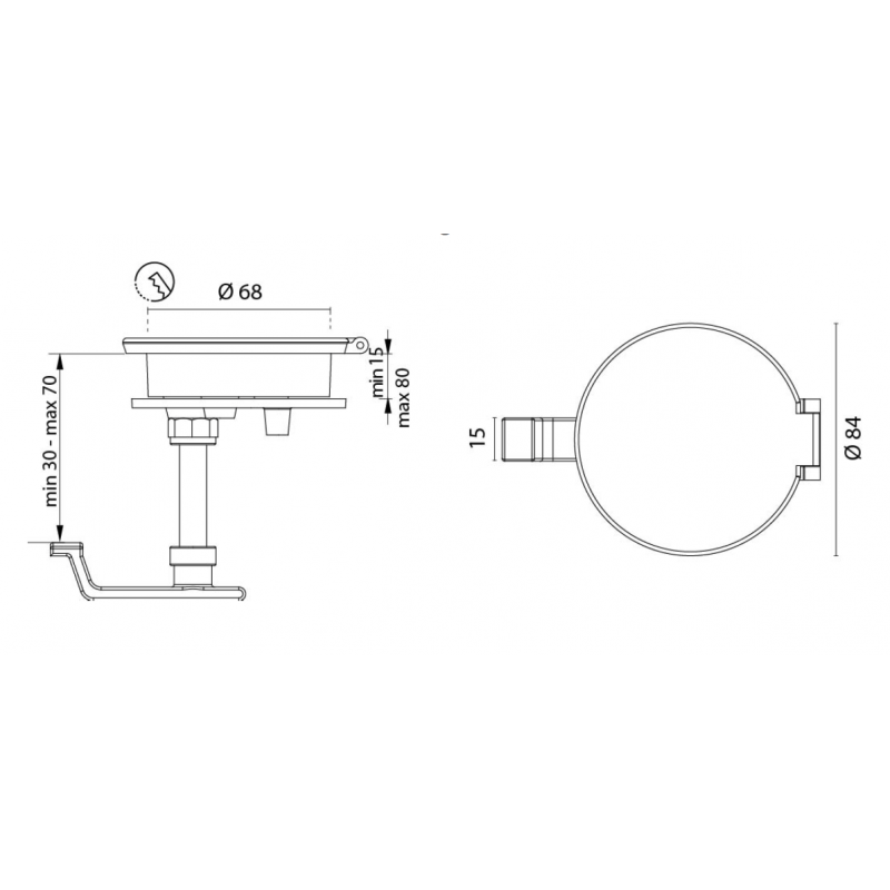 Alzapagliolo con tavella a tiraggio regolabile e chiusura stagna in ottone cromato Ø est. mm 84, Ø incasso mm 68.