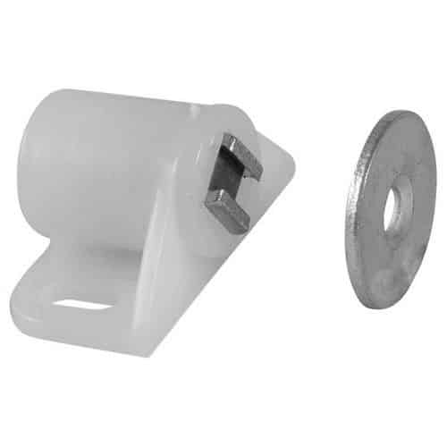 Ferma porte e portelli magnetico in plastica bianca con rondella, composto da due parti che si montano separatamente sulla parte fissa e sulla parte mobile.