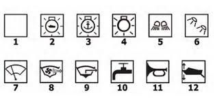 neutra (1), luce di via (2), luce di fonda (3), cabina (4), pozzetto-plancetta-coperta (5), luce di profondità-cortesia-roll bar (6), tergivetro (7), aspiratore (8), pompa sentina (9), autoclave (10), tromba (11), flap (12)