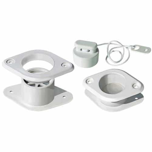Boccola di scarico in nylon bianco serie GIBSY con valvola di non ritorno, completo di tappo.