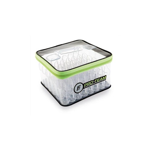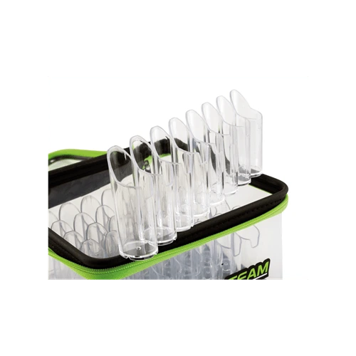 Borsa contenitore in eva trasparente con manico e cerniera 2 vie con 48 tubi porta esche interni.