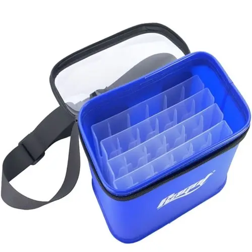 Borsa Ragot bakkan impermeabile porta artificiali dotata di tappo con cerniera, nasce per trasportare artificiali e grazie ai divisori al suo interno può contenere 24 jerkminnow, jig o wtd fno a 13 centimetri di lunghezza (negli scomparti non entrano popper o altre esche voluminose). Se vengono tolti i divisori può contenere accessori vari e piccole tackle box, dotata di cinghia in cordura per un fissaggio in vita.