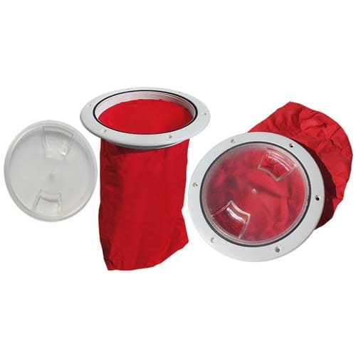 Botola stagna d’ispezione in ABS bianco e coperchio trasparente.Completa di sacca posteriore portaoggetti e documenti in nylon removibile.