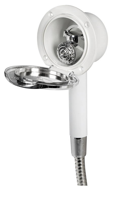 Doccia in ottone cromato, vano di alloggiamento bianco in ASA UV resistente.