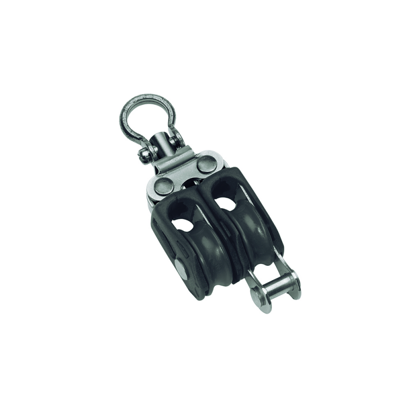 SERIE 0 -Bozzello doppio con occhio girevole e arricavo, Ø cima max mm. 5, max carico di lavoro kg. 275, carico di rottura kg. 550, dimensioni puleggia mm.20 x 8, lunghezza mm. 79