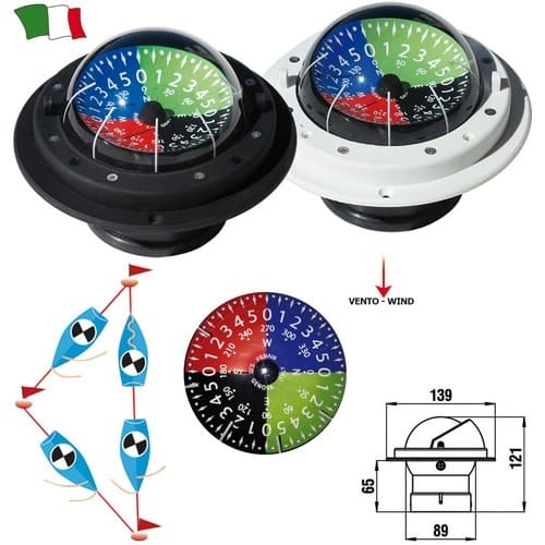Bussola modello “ZENITH BZT” con installazione ad incasso orizzontale e sospensione cardanica interna. Schermo antiriflesso con compensazione incorporata, completamente smontabile per eventuali riparazioni.