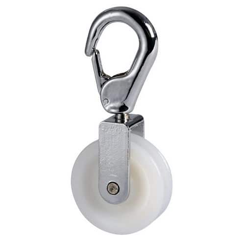 Carrucola con moschettone a molla girevole in ottone cromato.