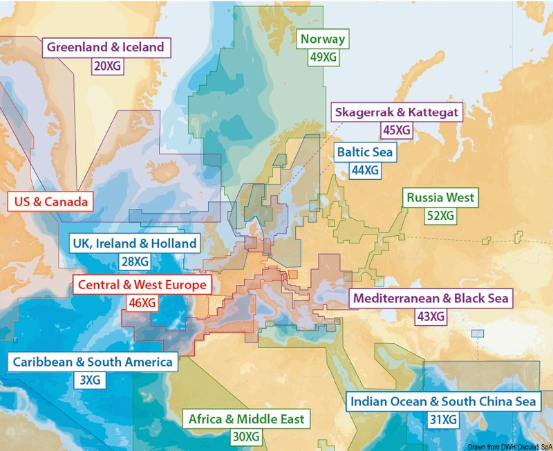 eccezionale dettaglio – linee batimetriche – SonarChart™ – Auto-routing – Plotter Sync – piani dei porti – correnti e maree – servizi.La scheda SD/Micro SD viene venduta vuota dando la possibilità all’utente di scaricare la zona di suo interesse tra quelle di seguito indicate in Italia o Europa dal sito navionics.com. Volendo è possibile scaricare anche la carta del Mediterraneo o zone analoghe, pagando la differenza sul sito navionics.com.