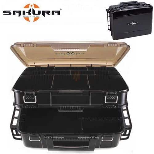 Cassetta Sakura costruita in polimero ultra rinforzato con copertura in policarbonato anti UV, ideale per riporre tutti gli accessori dal mulinello alla gamma completa di esche, bobine di lenza che trovano facilmente posto nei suoi grandi volumi. Il piano superiore è dotato di doppia chiusura tramite fibbie in acciaio inox abbinate ad un sistema a clip che fissa il coperchio, questo livello ventilato offre più di 20 scomparti con divisori regolabili che permettono di ottimizzare lo stoccaggio dell’esche.