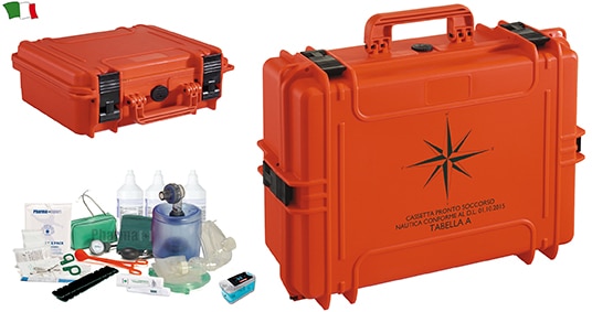 • 5 suture adesive steri strip mm 6×38 • 2 stecca per frattura • 1 termometro digitale • 2 buste ghiaccio istantaneo • 1 busta caldo istantaneo • 5 cerotti adesivi cm 10×6 • 1 pallone di rianimazione • 1 maschera oronasale adulti cal. 5 |