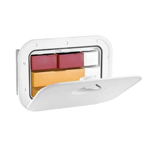 Cassettiera di colore bianco con sportello.