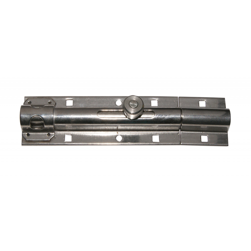 Catenaccio in acciaio inox con portalucchetto di sicurezza, viti di fissaggio invisibili.