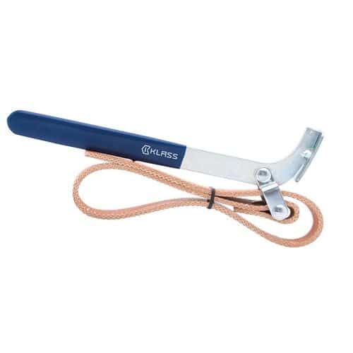 Chiave zincata con impugnatura rivestita di plastica e cintura in cuoio per la rimozione di filtri olio e benzina.