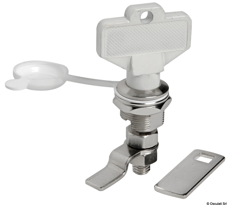 In ottone cromato, completa di cappuccio stagno di protezione. Rotazione a 90° con molla interna anti-vibrante. Completa di chiave. Doppia levetta in dotazione.