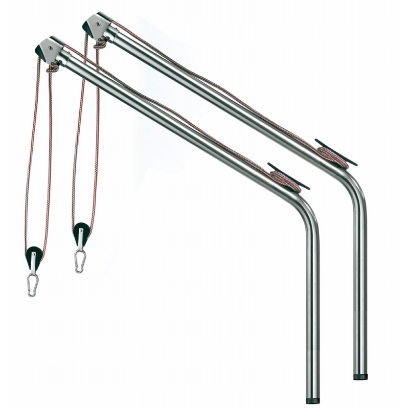 Gruette in acciaio inox. Complete di: carrucole, bozzelli, moschettoni, cimeper il richiamo, boccole da incasso che rendono le gruette girevoli edasportabili. La parte da inserire sotto coperta é lunga cm. 150 perchépossa essere tagliata alla misura desiderata. Sbraccio mm. 880, Ø tubo mm. 40, Ø foro mm 50, altezza mm. 1900, portata kg. 120.