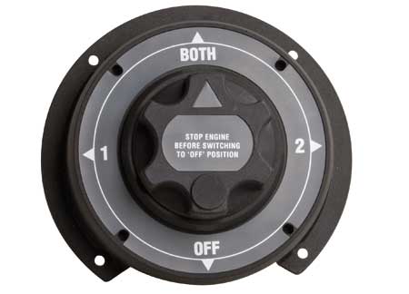 Deviatore staccabatterie di grande capacità tipo “Cole Hersee” da 300A che permette di staccare il circuito, di selezionare una delle due batterie oppure entrambe in contemporanea. Accessori per impianto elettrico barca camper.