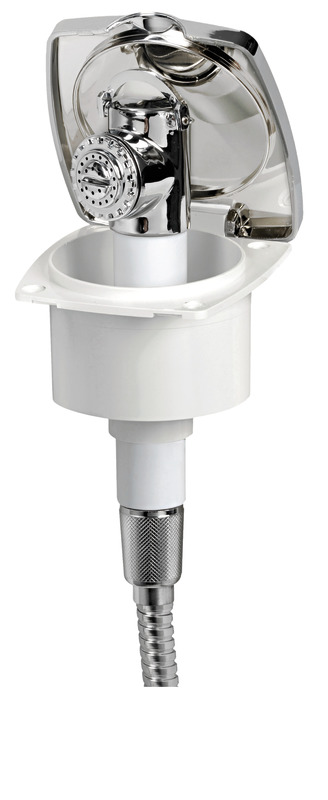 Doccia in ottone cromato, vano di alloggiamento bianco in ASA UV resistente.