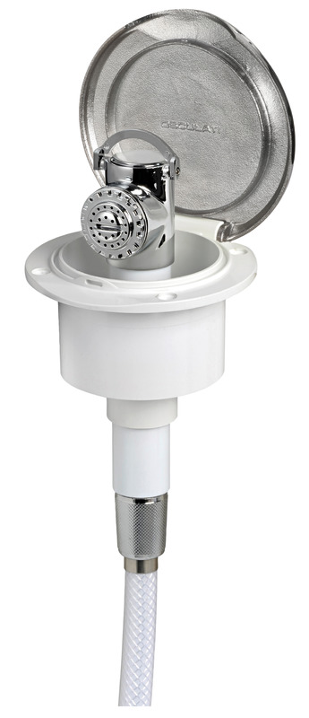 Doccia in ottone cromato, vano di alloggiamento bianco in ASA UV resistente.