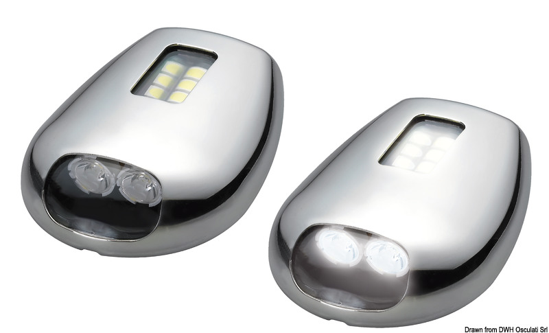 Luci da ormeggio con 2 opzioni: luce di prua con angolo 20°, LED HD 2,8 W e luce laterale con angolo 85°, 1,2 W. Le due luci sono controllabili separatamente. Non richiedono incasso. Corpo in acciaio inox AISI 316 lucidato.