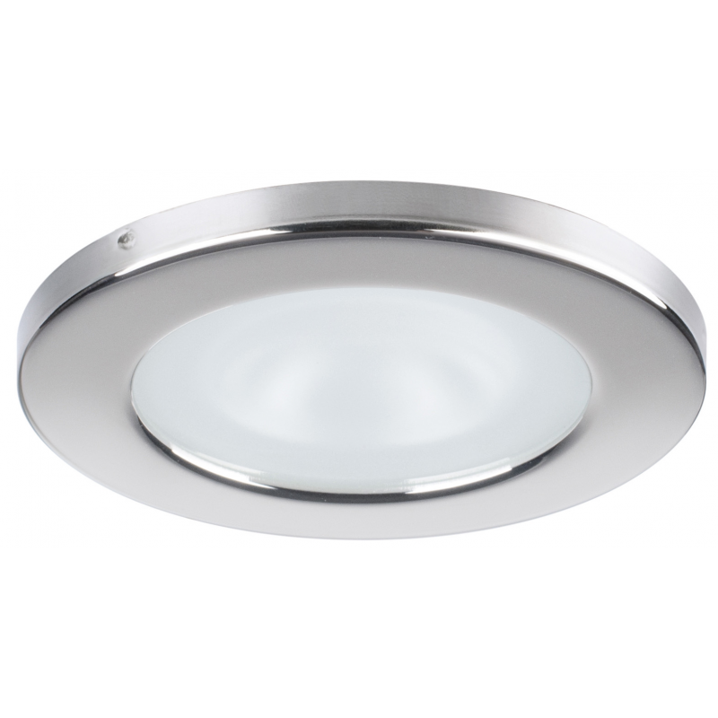Faretto stagno IP65 ad alta luminosità ( 280 Lumen ), luce bianca calda, con cornice circolare in acciaio inox AISI 316 lucido. Sensibile alla polarità.Fissaggio con viti (non incluse).