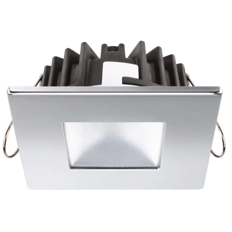 Faretto stagno IP 66, POWER LED ( 235 Lumen ) ad altissima luminosità, luce bianca calda con cornice quadrata in acciaio inox AISI 316 lucido.Sensibile alla polarità. Fissaggio con molle.