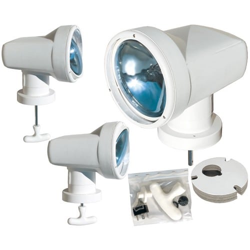 Faro orientabile manualmente tramite maniglia sotto coperta o sotto roll bar, con bulbo stagno “Sealed Beam”, provvisto di doppio filamento. Produce luce corta a largo fascio (100 + 100 metri) oppure luce di profondità (600 metri) a cono stretto. Rotazione a 340°, alto e basso 70°. Carcassa bianca in ABS, UV resistente. Completo d’interruttore.