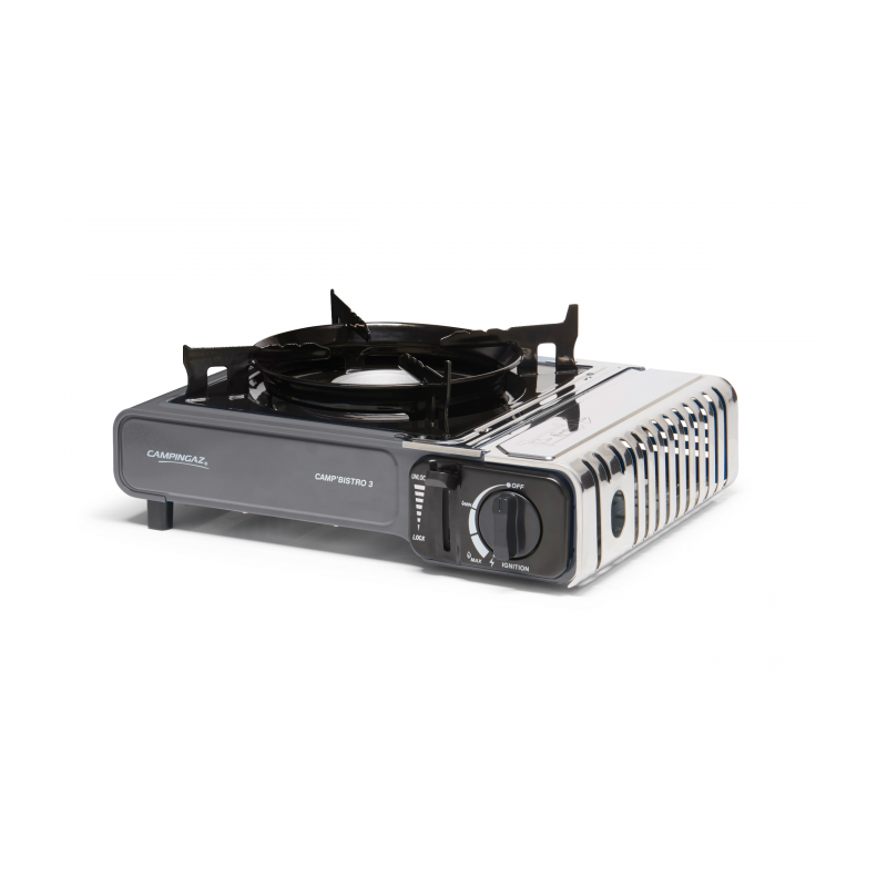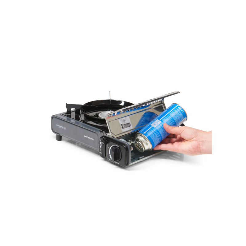 Fornello in acciaio, leggero e compatto, accensione piezoelettrica con sistema di chiusura di sicurezza della cartuccia per un utilizzo sicuro. Facile da pulire grazie al vano cattura grasso. Con valigetta per il trasporto inclusa.