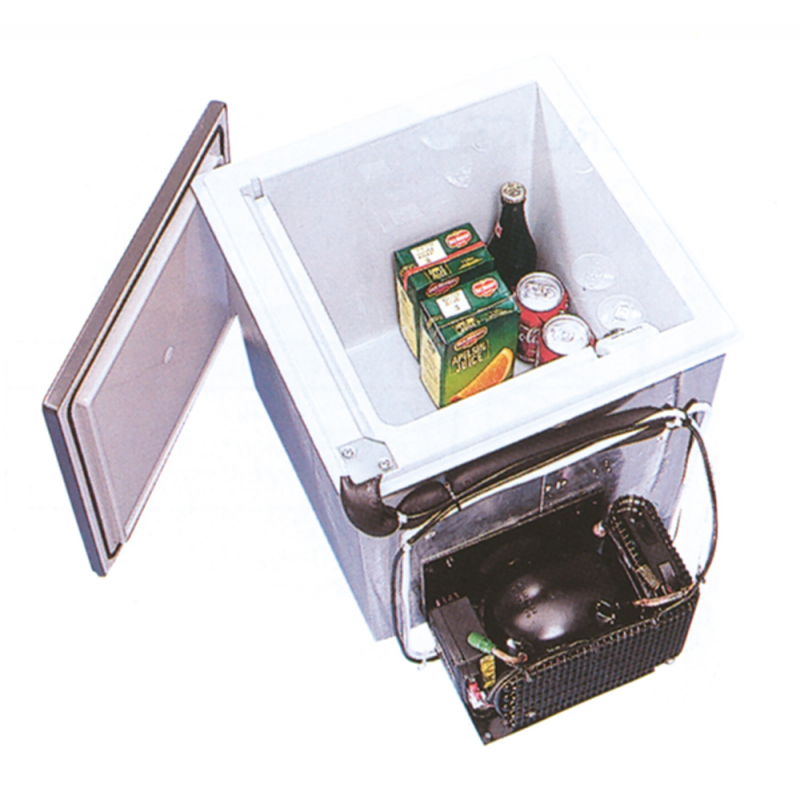 Rivestimento interno in acciaio inox e fondo in plastica. Può essere dotato di guide scorrevoli. Compressore ventilato installato nella parte inferiore del latocorto, che può essere spostato fino ad una distanza di mt. 1,5. Dim. mm. 455(+165) h x 480 lar. x 801 lung.