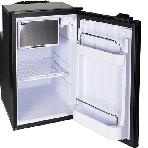 Frigorifero ISOTHERM 49 litri provvisto di controllo elettronico che spegne il frigo quando la tensione scende sotto 10,4 V e riparte quando risale a 11,7 V (valori regolabili rispettivamente fino a 9,6 e 10,9 V) e velocità di rotazione 2000-2500-3000 RPM regolata secondo il volume da raffreddare e velocità forzata.