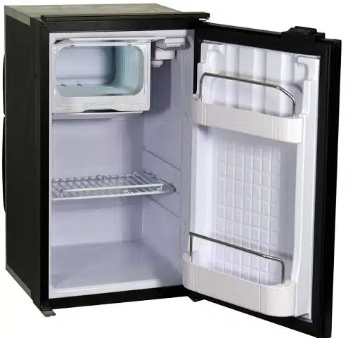 Frigorifero ISOTHERM provvisto di controllo elettronico che spegne il frigo quando la tensione scende sotto 10,4 V e riparte quando risale a 11,7 V (valori regolabili rispettivamente fino a 9,6 e 10,9 V).