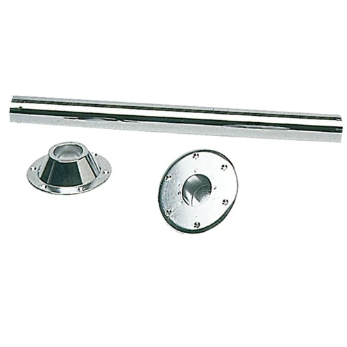 Gambo tavolo costituito da un tubo in acciaio inox e due basi di raccordo in alluminio, una da incassare a filo pavimento, l’altra da montare sotto il piano del tavolo. Il tubo ha le estremità autobloccanti ed il tavolo si può mettere e togliere istantaneamente.