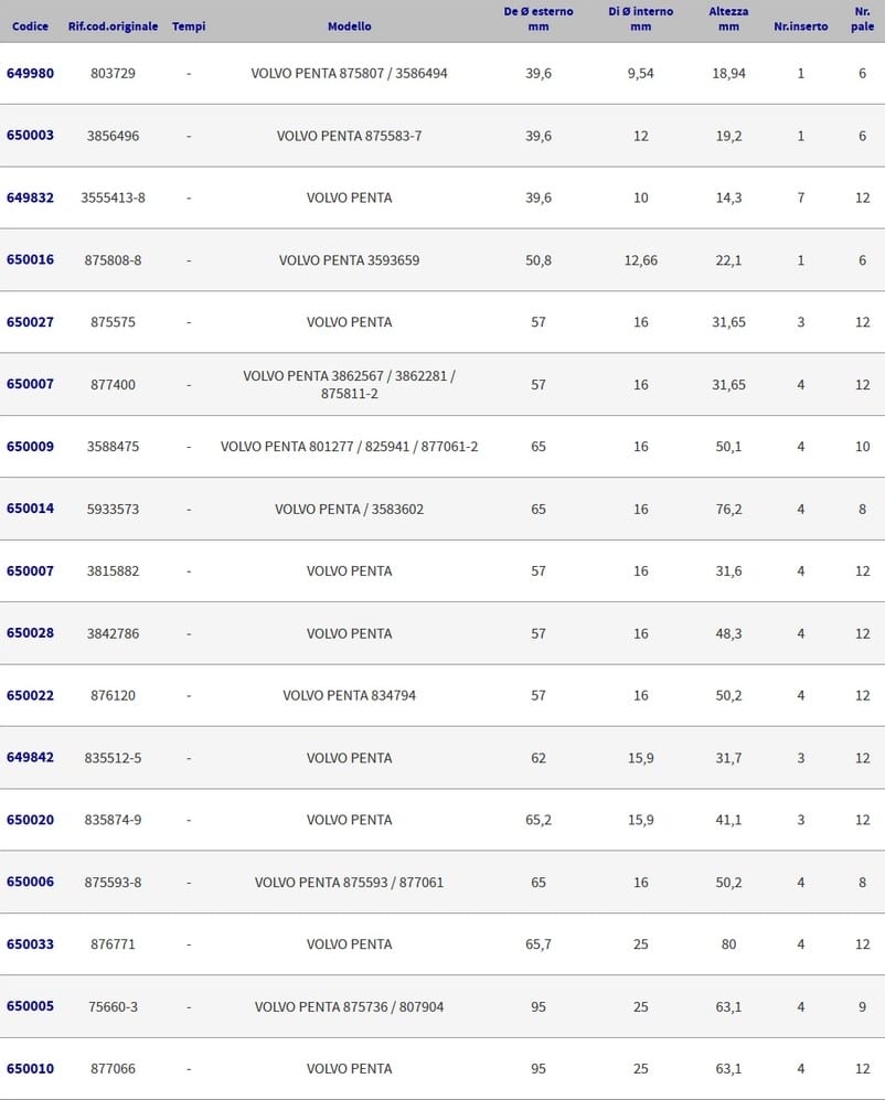 Giranti in neoprene per motori entrobordo Volvo Penta.