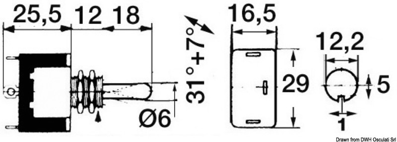 Carcassa in termoindurente resistente ad alta tensione, contatti in argento, leva di manovra e bussola in ottone nichelato. Capacità 15 A. Modello robustissimo e funzionale. Terminali “Faston”, perno 12×10 mm. Collegabili a due circuiti separati.