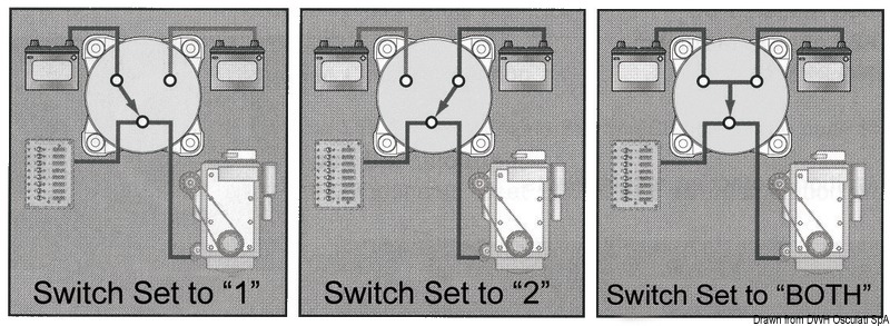 Serie di interruttori e deviatori che permettono di attivare/disattivare, combinare e/o separare i banchi di batterie per motori e servizi.