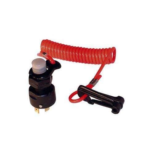 Interruttore di sicurezza con cappuccio e cordino a strappo che interrompe il circuito e spegne il motore fuoribordo nel caso si venga sbalzati in mare. Sostituisce il sistema presente nel motore in caso di assenza o avaria.