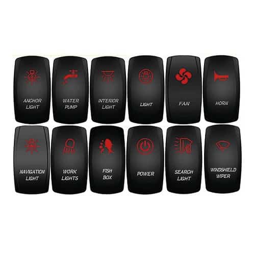 Luce di fonda / Anchor Light, Pompa acqua / Water Pump, Luci cabina / Interior Light, Luce / Light, Aspiratore / Fan, Luci di via / Navigation Light, Luci lavoro / Work Light, Vasca pescato / Fish Box, Accensione / Power, Faro / Search Light, Tromba / Horn, Tergicristalli / Windshield Wiper, Pompa Sentina / Bilge Pump, Ancora / Anchor, Su-Giù / Up-Down