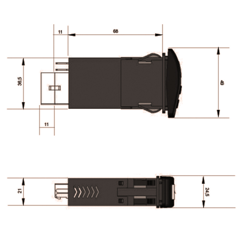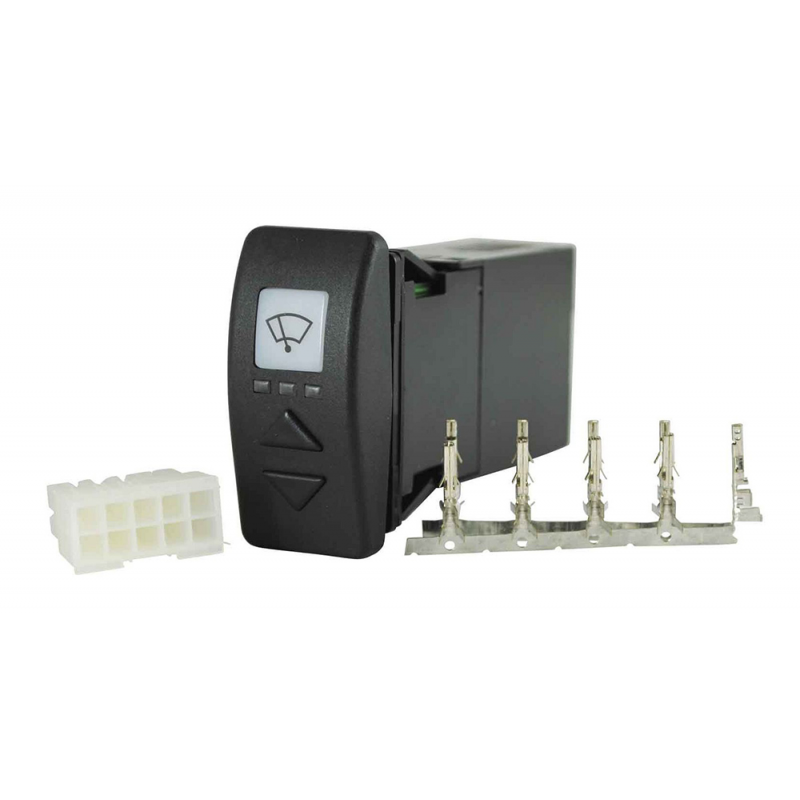 Interruttore intelligente universale per la gestione di un tergicristallo. Uguali ai Carlingswitch come dimensioni e aspetto, alimentazione 12/24 V, retroilluminazione a LED.acceso-spento, 3 livelli di intermittenza indicati dai LED, 1 o 2 velocità (dove previste dal tergicristallo), parcheggio automatico, programma lavaggio automatico.