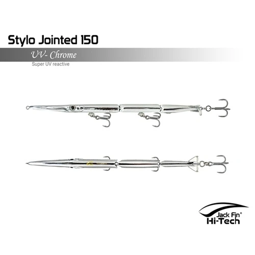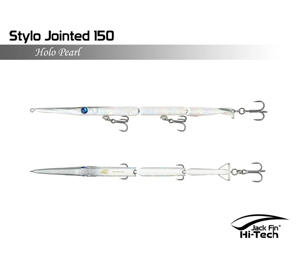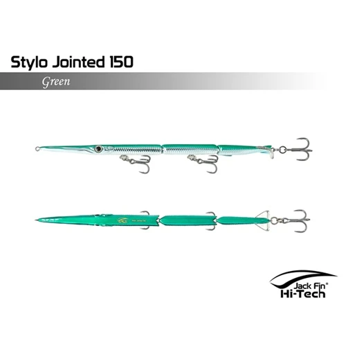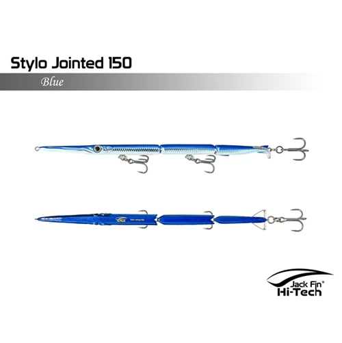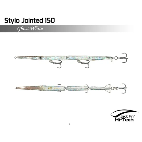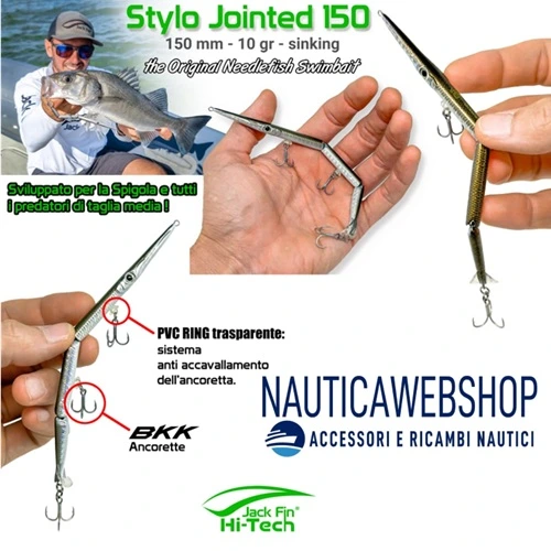 Artificiale Jack Fin Stylo 150 Jointed è un’apprezzata esca snodata da spinning per imitare in modo realistico in modo realistico il movimento dell’aguglia, ideale per la pesca della spigola e pesci serra. L’esca è snodata in tre sezioni e dotata di un innovativo “paddle tail” (coda a paletta) che genera un movimento sinuoso ed estremamente naturale, rendendola realistica “come una vera aguglia”. È efficace sia con recuperi veloci (per pesci attivi) che lenti (per pesci apatici).