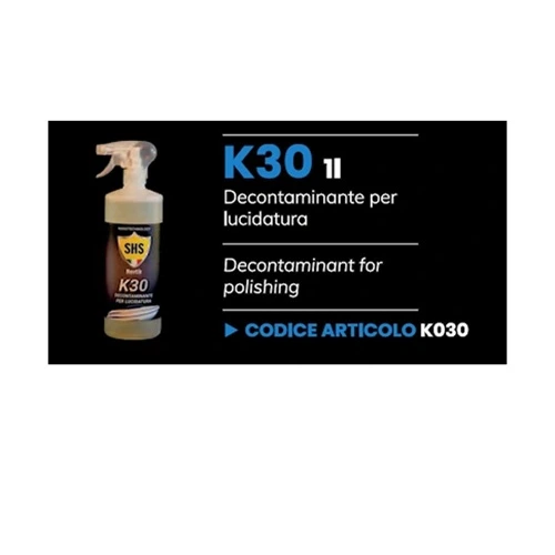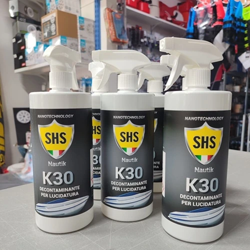 Prodotto K30 SHS decontaminate per lucidatura, adatto per rimuove le impurità presenti sul Gelcoat e vernici per facilitare la lucidatura (calcare, residui di smog, ecc…) Utilizzabile anche su superficie acciaio. Prodotto per la rimozione del calcare. Accessori per la manutenzione di barche, gommoni, camper e auto.