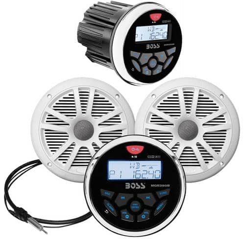 Radio Stereo MP3 player bluetooth Boss Marine MGR350B, completo di una coppia di speaker MR6W (nostro articolo 629087 G) da 180 W cadauno e antenna FM MRANT 10.