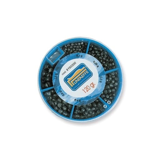 Scatola contenente 120 g di pallini spaccati in misure piccole, da 0.2 g a 1 g.