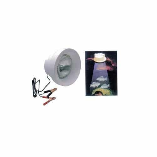 Lampada galleggiante a tenuta stagna,da 50 watt a 12 V. Si utilizza di notte per attirare i pesci. Completa di cavo e pinzette di attacco alla batteria.
