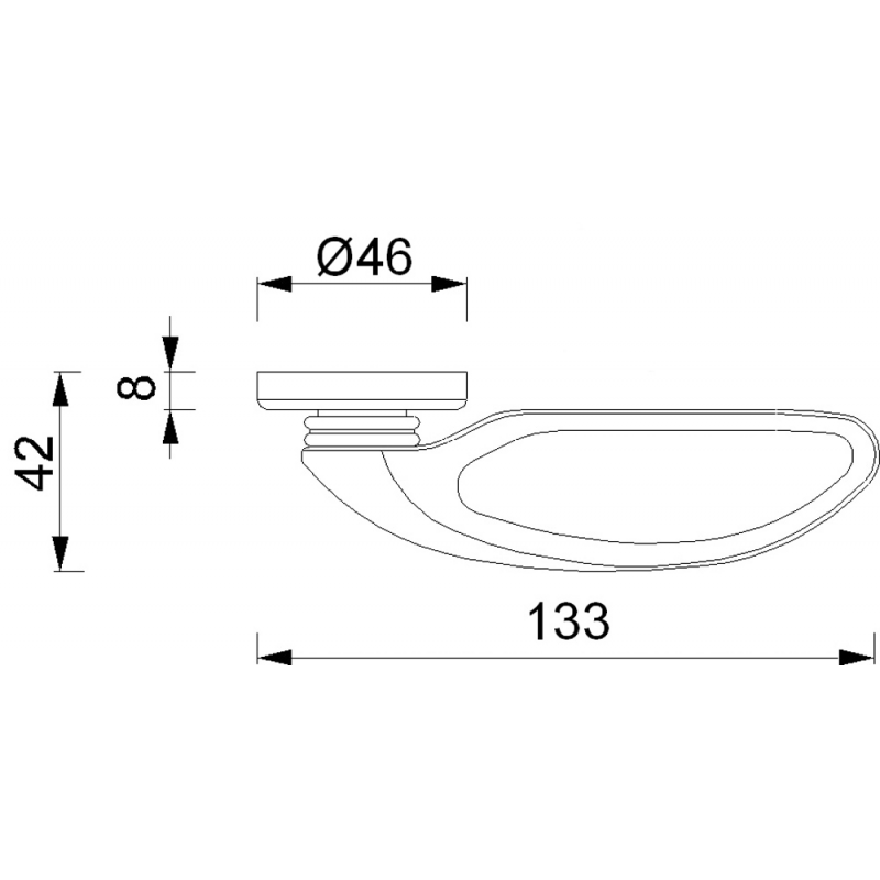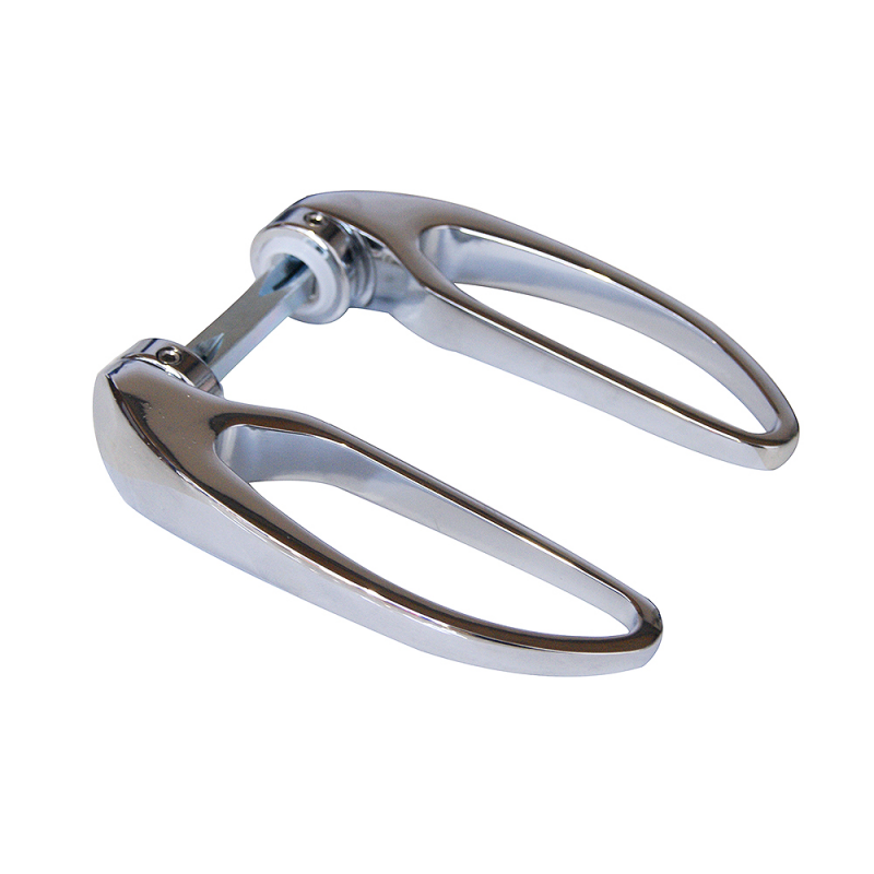 Maniglia completa di bocchetta, per rafforzare la molla della serratura e permettere il montaggio senza viti esterne. Lungh. mm. 133, sporgenza mm. 42, rosetta Ø mm. 46, quadro mm. 8.