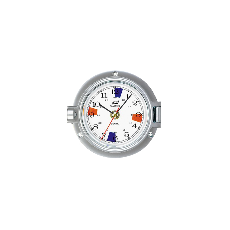 Orologio in alluminio cromato opaco con meccanismo al quarzo con zona silenzio radio, vetro minerale smussato. Modello apribile