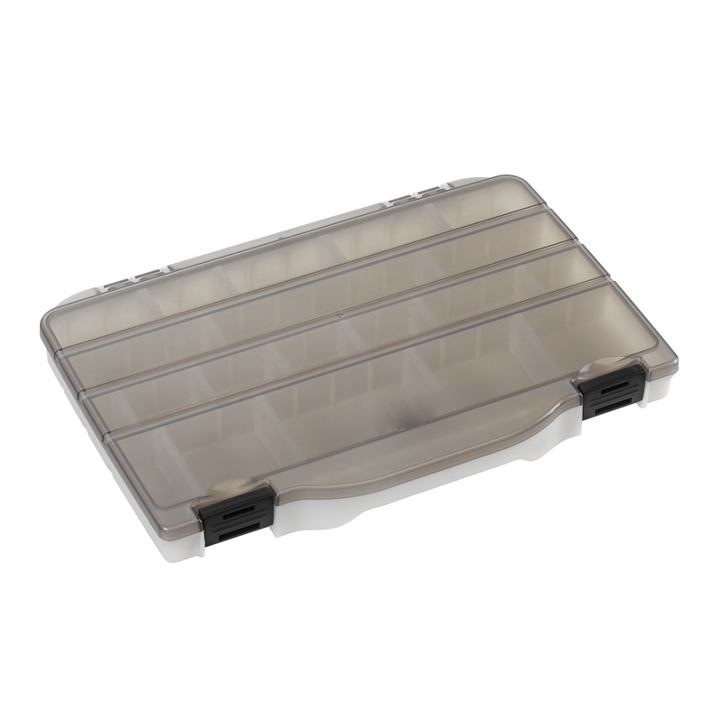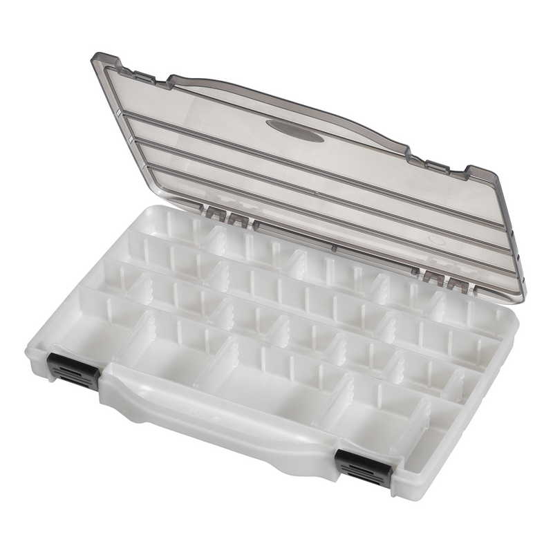 Scatola Porta Minuterie 198 in plastica da pesca con misure interne 276 x 186 x 27 mm / 10.87 x 7.32 x 1.06 inch. Colore del fondo avorio e coperchio fumè. Dotata di sistema di chiusura ad incastro tra fondo e coperchio per impedire il passaggio degli oggetti, questa scatola porta minuterie è disponibile nella configurazione con divisori mobili che conferisce la possibilità di realizzare da 4 a 20 scomparti interni.