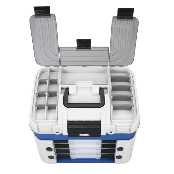 Valigetta 502 in plastica da pesca con misure interne 420 x 303 x 400 mm / 16.53 x 11.92 x 15.75 inch. Colore del fondo blu, accessori grigi e serrature nere. Questa valigetta da pesca è dotata di un coperchio con 3 scompartimenti e divisorie mobili per organizzare la propria attrezzatura da pesca. Materiale: polipropilene. Impreziosita dal sistema di blocco con doppio gancio per una chiusura pratica e sicura, include 1 scatola porta artificiali (art.190 spin) e 4 scatole con divisiorie mobili (art.194).
