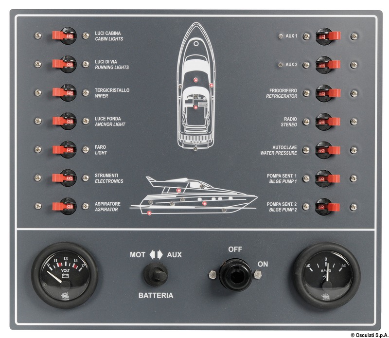 Completi di voltometro e amperometro e di staccabatteria 14.385.00. Completi di check-panel a LED extra luminosi che si accendono in corrispondenza dell’utenza in uso.