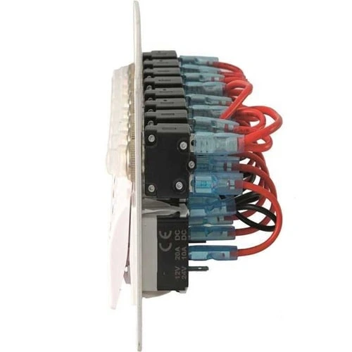 Pannello in alluminio impermeabile IP65 con interruttori a bascula e luce led e valvole automatiche reinseribili. Completo di viti montaggio e set etichette.