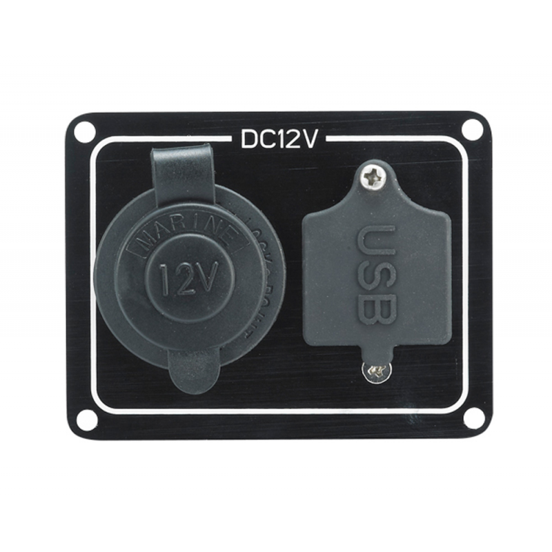 Pannello in alluminio nero stagno IP65 con presa accendisigari a 12 vdc e alimentatore usb da 5 vdc.